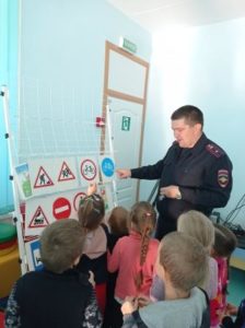 Инспектор ГИБДД подробно объяснила детям как надо вести себя на дорогах, проговорили про пешеходный переход и светофор. Анастасия Олеговна посетила в младших группах родительские собрания, где напомнила родителям по детское удерживающее кресло в автомобиле, про то, что надо держать ребенка за руку, когда переходишь дорогу и про правила дорожного движения.