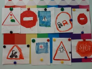 изготовлены настольно – печатные игры «Собери светофор», «Составь дорожный знак». На стендах и в родительском уголке размещена информация о профилактики дорожно-транспортного травматизма, о использовании ремней безопасности и удерживающих устройств, при перевозке детей в личном автомобиле, о том, как и где надо переходить дорогу. Свои знания дети закрепили в продуктивной деятельности — аппликации «Веселый светофор» и рисовании «Пешеходный переход».